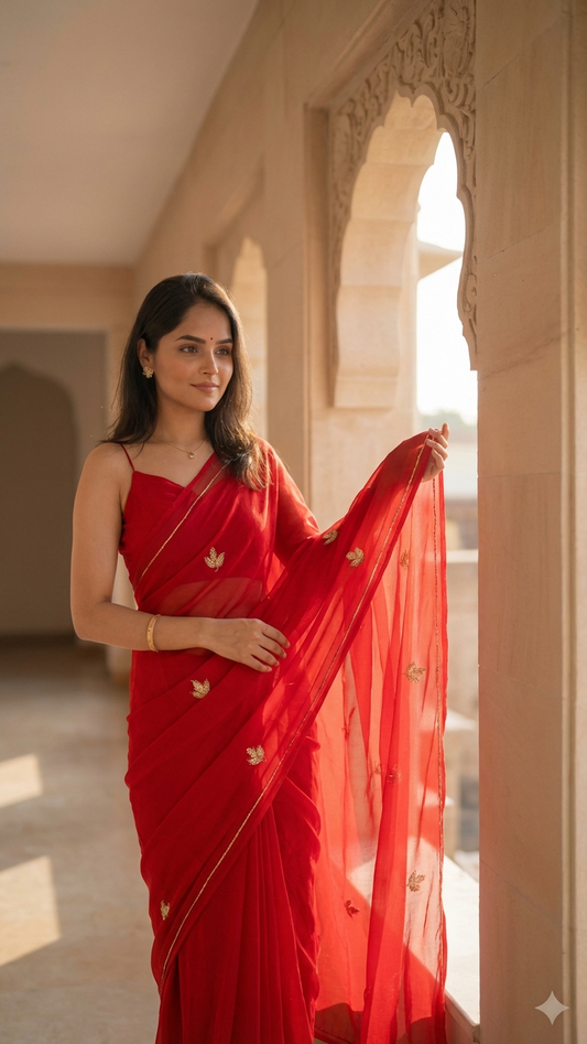 Muralika Red handwork Chiffon Saree