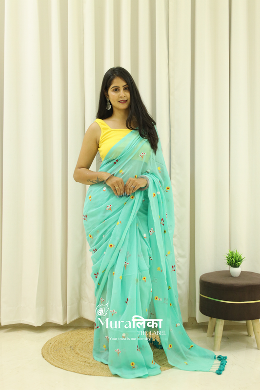 Phoolwari Green Embroireded Mulmul Cotton Saree